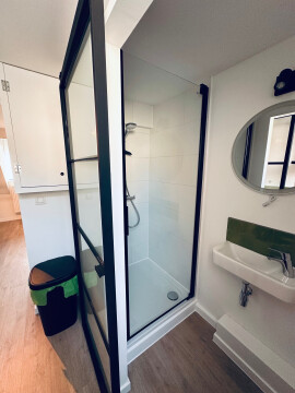 De studio is recent volledig vernieuwd en uitgerust met gloednieuwe meubelen. Ze beschikt over een eigen keuken en privébadkamer, waardoor je geniet van alle comfort en privacy. De moderne afwerking en slimme indeling maken optimaal gebruik van de beschikbare ruimte.