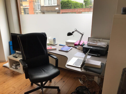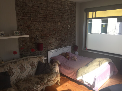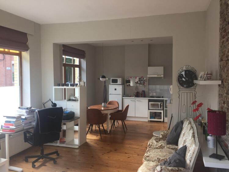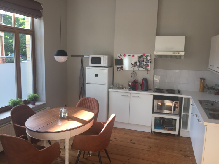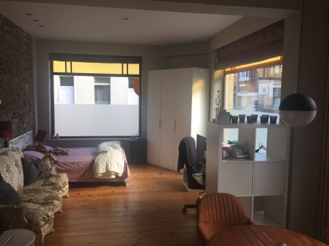 sfeervolle studio op het gelijkvloers met veel daglicht en houten vloer.