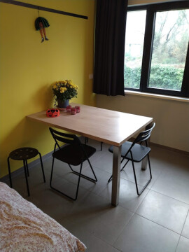 The studio itself perfectly allows for autonomy as it is equipped with its own bathroom and kitchen. The kitchen provides a lot of storage as well as appliances such as a microwave and two plates for cooking. The main area of the room is equipped with fixed furniture such as a double bed, two wardrobes (cupboards), two desks with magnetic picture walls, curtains and lightnings. Upkot provides Wifi, bike parking, large terraces and a lot of nice parks very nearby. The Blamerseen area is especially beautiful. Moreover, we (Hanna and Magda, the two current tenants) would also leave over some of our equipment to you including 4 chairs, a mattress, a clothes horse and additional lamps. If you take care, we would also entrust you our beloved palm tree.