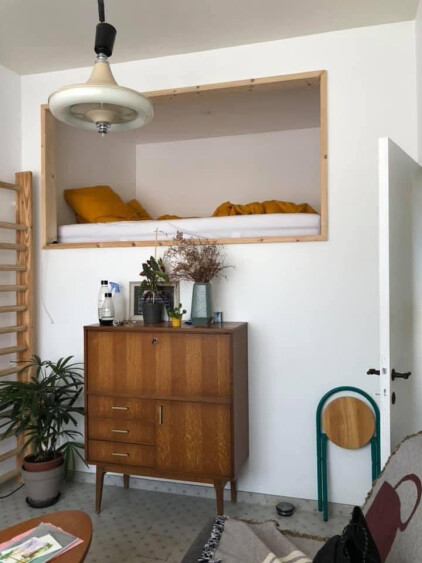 Woonkamer van 12m2 + hoogslaper van 3,5m2.