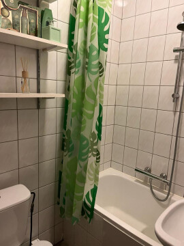 Badkamer bestaat uit een douche/zitbad, wasbak en wc + rekjes om je spullen op te leggen
